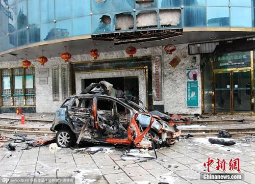 爆炸后汽车完全损毁,银行的墙面也遭到损坏。