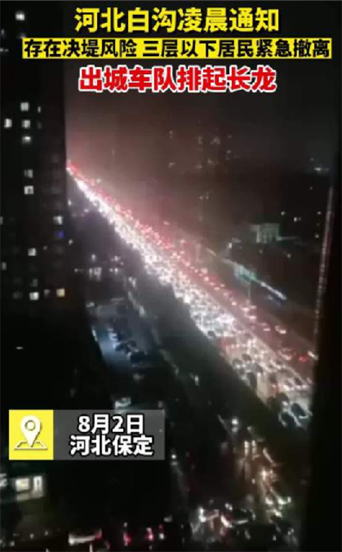 8月2日,河北保定。河北白沟凌晨通知,存在决堤风险三层以下居民紧急撤离,出城车队在高速路口附近排起长龙。