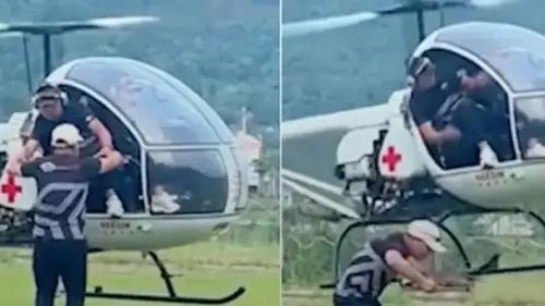 原标题:贴有红十字会标志的直升飞机送烤全羊,当事人回应:个人飞机,参与应急演练后未及时清除