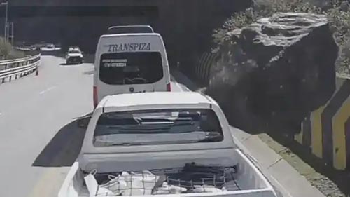 事发地点位于秘鲁瓦罗奇里省一条单线双向的山边公路上,监控画面显示,这辆皮卡车正停靠在路边,突然一块巨大石头从山边滚下,精准砸中。