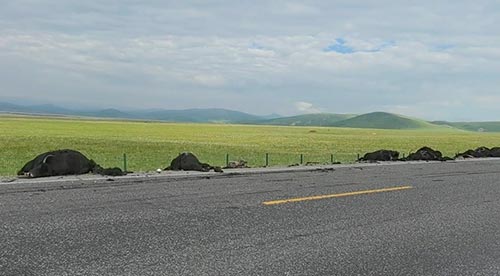 8月1日,有定位为甘肃甘南州尕海镇的网友发布视频称:“撞了这么多头牦牛,得赔多少钱哦,大货车车头都变形了……”视频显示,有10多头牦牛一字形躺在路边,镜头远处停着一辆大货车。
