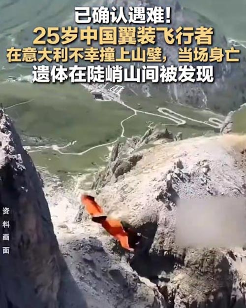 据报道,意大利当地时间8月5日13时45分左右,意大利南蒂罗尔州地区发生一起事故,一名25岁的中国翼装飞行者从皮兹达莱克山高处跃下时,不幸撞上山壁,当场身亡。