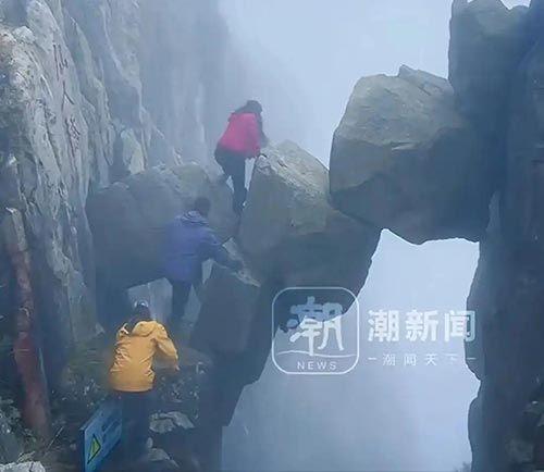 原标题:网友拍视频称“3名游客爬上泰山仙人桥悬空巨石,旁边就是禁爬提示”,景区:正核查