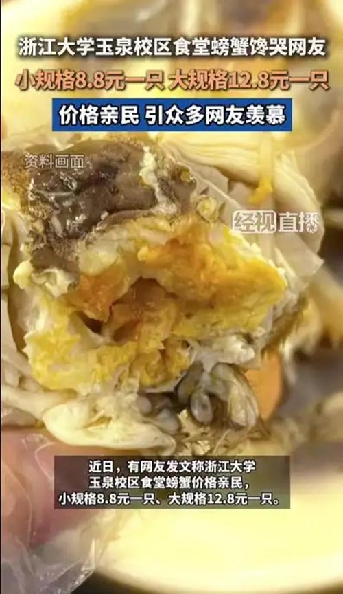 经视直播记者随后联系浙江大学后勤集团。工作人员表示,浙江大学设有多个食堂,主要为方便在校学生就餐。“学校有专门的采购供应部门,螃蟹属于直接采购。我们并非刻意与校外比价,而是根据校内定价系统确定价格,对校外市场价格并不太了解。”