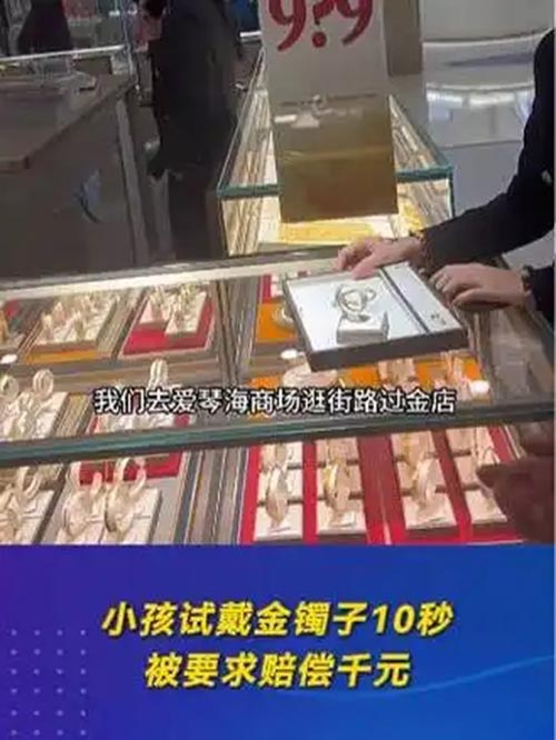 【#中国黄金回应试戴金镯10秒被索赔1000#】11月12日,据媒体报道,女子带孩子逛金店时在营业员全程注视下试戴了一个手镯不超过10秒,取下来时营业员说手镯变形要求赔偿1000元,否则不让她们走。该女子表示,手镯太大,甚至都没怎么碰到孩子的皮肤,当地民警到场后也认为营业员做法可笑。13日,后浪视频咨询中国黄金客服表示,店员都是有经过培训的,试戴需要店员帮忙佩戴,对于此事客服部不了解具体情况,具体会有工作人员核实处理。