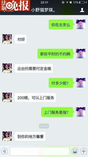 5月4日下午,“小野猫”又联系记者,说当晚有时间,可以上门服务,让记者先发200元。记者问打了钱,其不出来怎么办?“小野猫”回复,自己已经在“盘丝洞”上约了10名男性用户,“做小姐的,都是长期服务”。