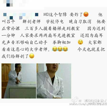该校一名学生称,视频中让学生扇耳光的老师为该学院医学院教解剖课程的老师,姓吕,“本来今天(8日)晚上因为停电,不上晚自习的,后来又通知要上,学生们摸黑爬楼梯,就因为晚自习迟到了几分钟,吕老师就让学生互相扇耳光。”