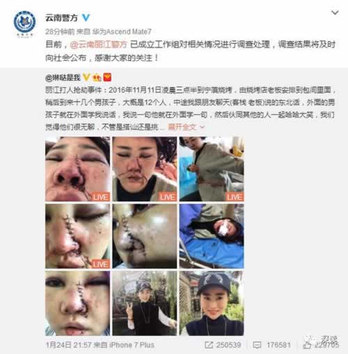 日前有女网友深夜发微博求助,称自己在丽江某烧烤店就餐时,遭数名当地男子挑衅殴打,施暴者还拿碎酒瓶划伤自己的脸部,并在拍摄视频威胁后扬长而去。该网友还称,自己被打时店老板并未阻拦和报警。过程简直可怕。