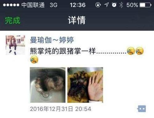 近日,网上流传帖子称,北京昌平区曼瑜伽馆法人、安徽籍女子史婷婷有多次非法食用野生动物的行为,并在其微信朋友圈找到了她非法食用熊掌的照片。网帖截图的照片显示,一位微信名为“曼瑜伽~婷婷”的用户发朋友圈称“熊掌炖的跟猪掌一样……”,并配发两张疑似熊掌的照片。网帖称,志愿者已将这些图片以及她的个人信息截图下来,作为证据向北京市有关部门举报。