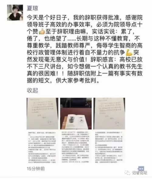 事实上,近年来因为不满现行的 "高校行政管理体制 "而辞职的高校教授、老师早已不是新闻,也非零星个案或少数,但能像夏琼教授这样将 "不满 "老实的,坦言讲出,却真心不多。