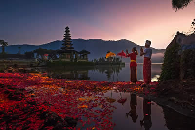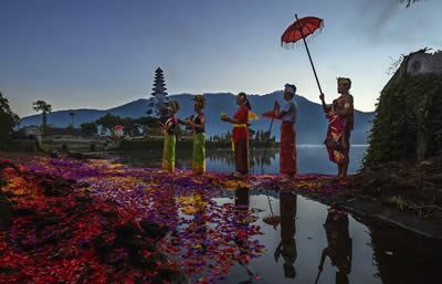 早晨的布拉坦湖神庙,美得就是一幅画。偶尔飘来的山风,变化莫测的光线,都让它充满神秘的韵味与色彩。特别是祈福的印尼女人,身着艳丽的民族服装,踩着有点冷的湖水,扭动着婀娜多姿的身躯,像天女一般在祈祷和散花。游客可以站在湖岸上,用不同的角度,欣赏这座水神庙和印尼美女在水一方的美丽姿态。