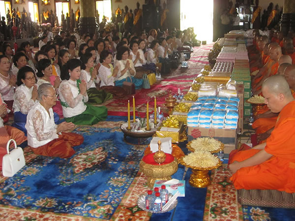 当天,位于曼谷附近的泰国著名寺院法身寺举办三宝佛节法会,众多民众前往斋僧,诵经祈福。