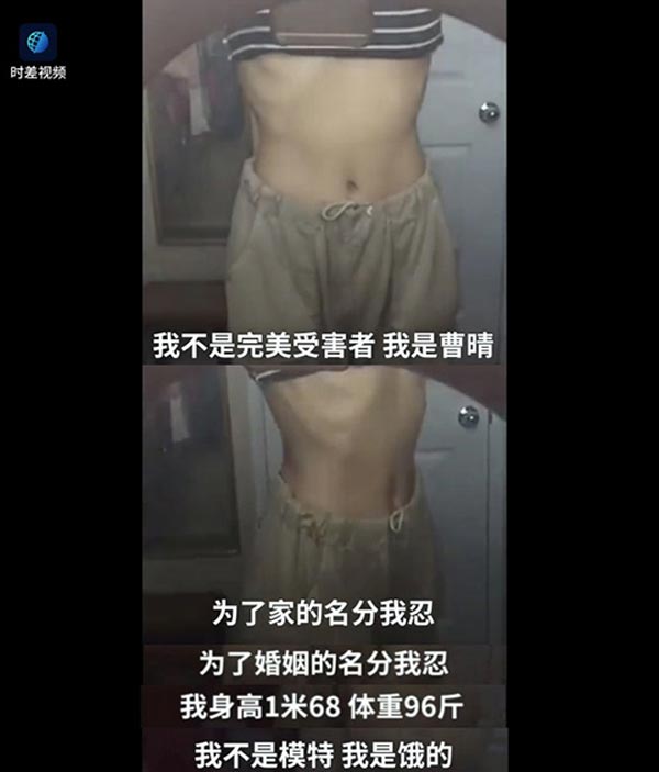 8月31日,曹晴发视频自曝丈夫只留米饭给她吃。随后,曹晴疑似遭受虐打。在另一段自述中,曹晴露出骨瘦如柴的身体。“身高1米68,体重96斤,都是饿的!”并谴责“我在挨饿,你们在中国笑,还有人性吗”?