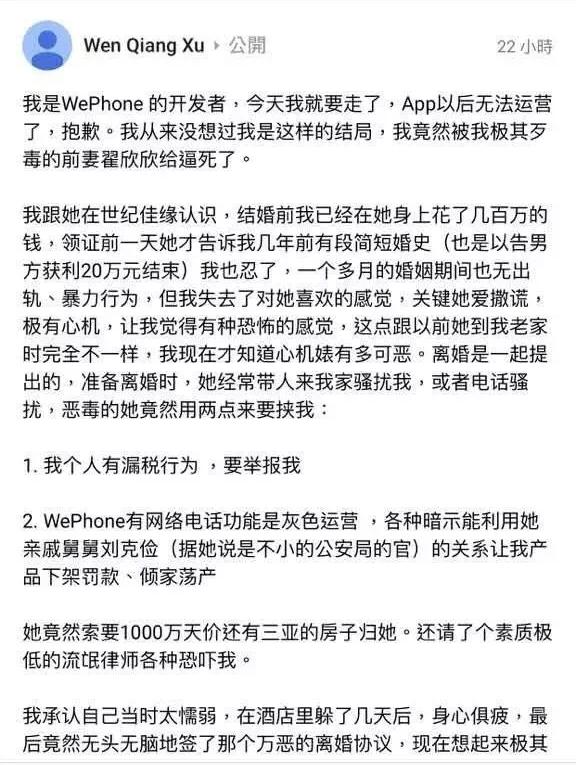 9月8日,有网友发帖称:WePhone开发者苏享茂因被前妻翟欣欣索要1000万元和房产赔偿,否则就要举报其WePhone属于非法电信业务,苏享茂被苦苦相逼后自杀身亡。这是一则令人惊讶的新闻。