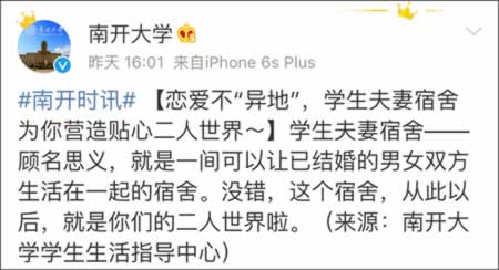 10月26日,南开大学的官方微博发了一条狗粮消息:已婚的学生可以申请夫妻宿舍了。