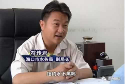 2009年7月6日,时任海口水务局副局长的符传君接受海南新闻频道采访,被问及“为什么常年未能解决海口污水”,竟然回答称“中山、东莞一带,包括我们现在的在长江三角洲附近的、苏州、浙江一带,就是说只要发达的地区,越发达,水越黑。”
