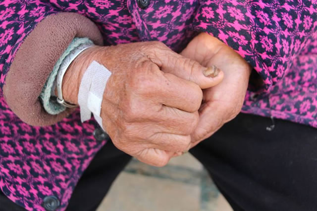 “我今年也72岁了,各种病,高血压、冠心病,刚从医院输液回来,越来越没有力气照顾老头子了......”手面上还有刚输完液留下的淤痕,虽然从小做农活身体强健,可也阻挡不住岁月的摧残及日夜操劳对身体的损害,发白的头发、渐渐弯下的腰背,让人无不心疼。