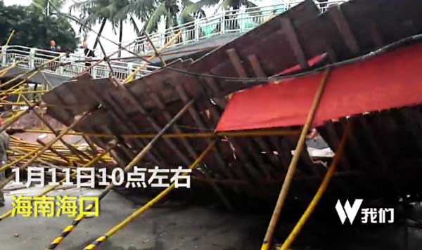 原标题:实拍海南施工脚手架坍塌4人被困 目击者:事前听到怪声