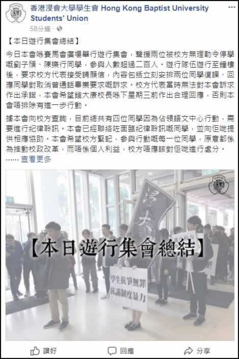 对于校方的这一决定,浸大学生会表示不满,并于25日早上在脸书发帖,要在26日在校内发起游行集会。