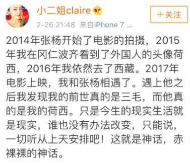 昨天开始,一篇题为《导演张杨,我爱你》的微信文章热传,作者声称自己跟导演张杨有了婚外不正当男女关系,并为这种关系寻找了诸多的理由,其中包括自己是所谓的“三毛转世”。