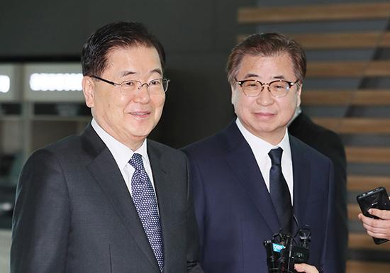 当地时间2018年3月8日,韩国仁川机场,韩国青瓦台国家安全室室长郑义溶(左)和国家情报院院长徐薰出发访美,将向美方介绍此次访朝结果。