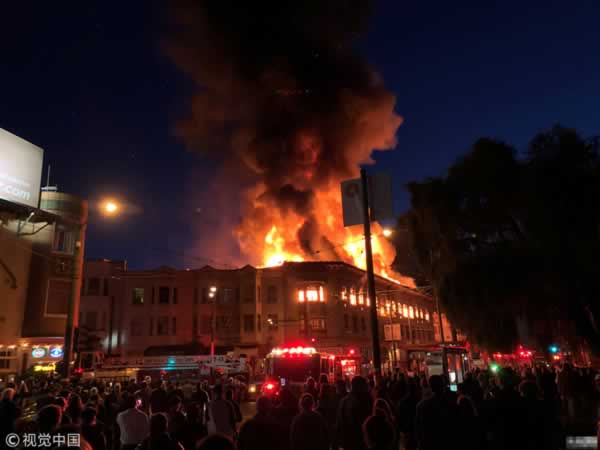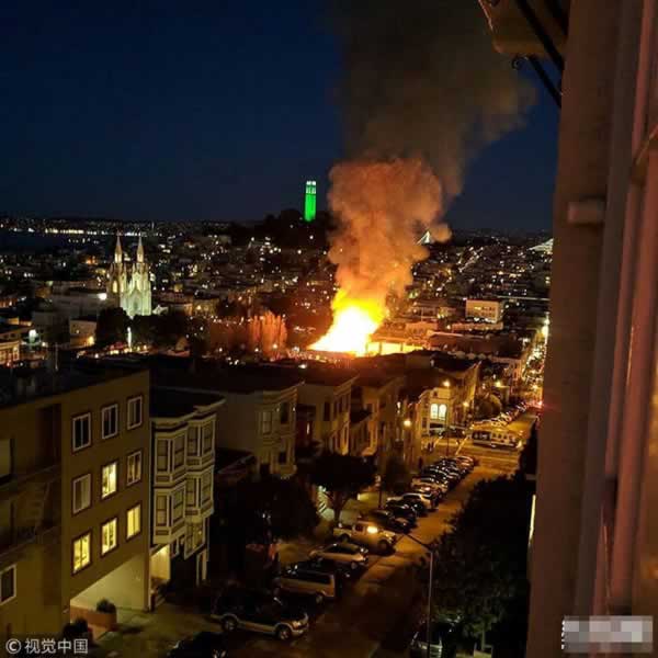 美国旧金山一建筑发生火灾 现场火光冲天