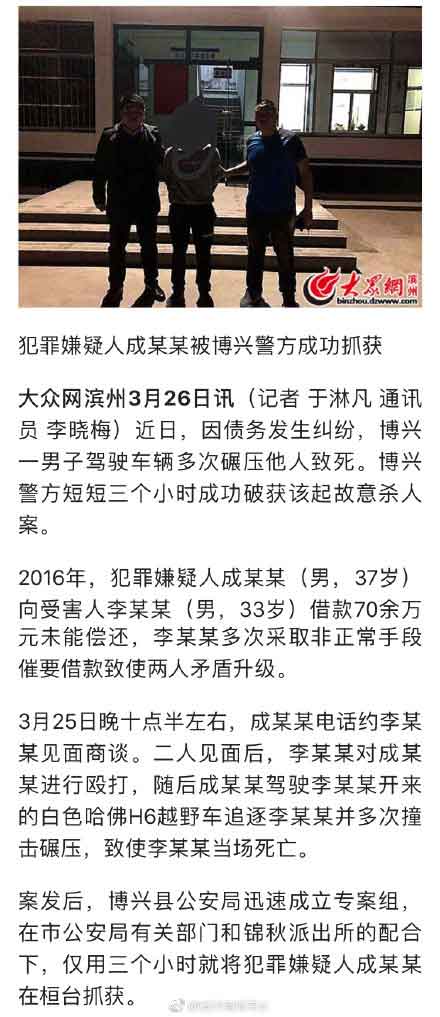 3月26日,爆料,3月25日在博兴县城张建材城有一起命案,男子将催债人开车撞击,来回碾压致死并逃窜!从媒体报道中得到了证实,警方三小时将嫌疑人捉拿归案!