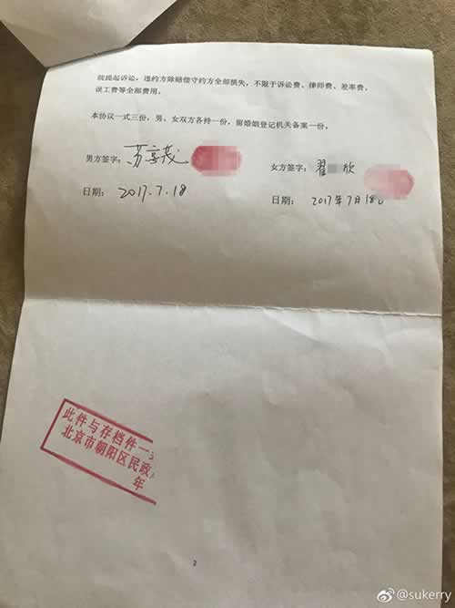 网传苏享茂和翟某欣的离婚协议书。 微博@sukerry图