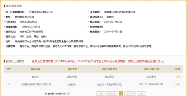 4月26日,澎湃新闻查询公开资料发现,海南赛马会投资控股有限公司成立于2015年7月15日,最近核准日期为2018年4月13日,注册资本3亿元,法人代表为赵铁林。所谓核准日期,即指该企业最近一次的法定变更登记申请被核准的日期。