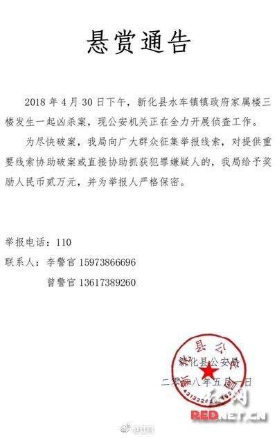【娄底新化发生一起命案 警方悬赏2万追凶】4月30日下午18时许,娄底新化县水车镇发生一起命案,一人死亡。死者马某郴,女,现年43岁,水车镇水车群工办工作人员。