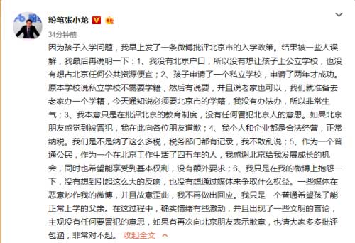 晚上6点左右,张小龙发微博道歉称:“因为孩子入学问题,我早上发了一条微博批评北京市的入学政策。结果被一些人误解,我最后再说明一下: