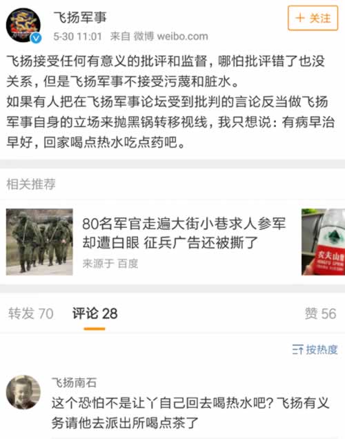 不过很快,飞扬军事网站官方微博号来辟谣了,表示不接受“污蔑和脏水”。