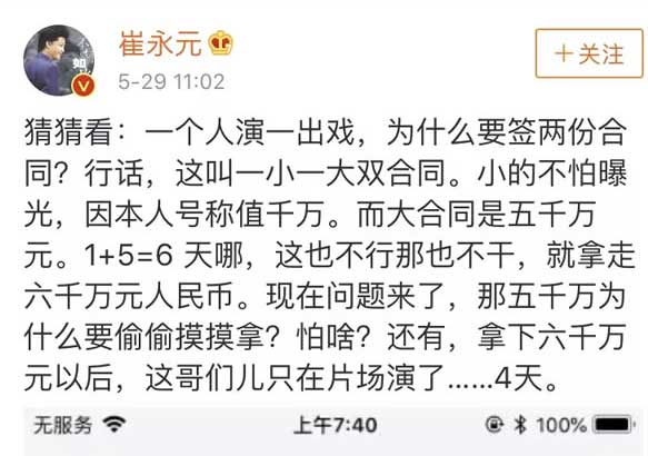 近日,由于对电影《手机2》开拍的不满,崔永元在个人微博怒怼该电影的主创人员,并“顺手”曝光了疑似相关艺人涉嫌偷税漏税、阴阳合同、4天6000万天价片酬等问题。