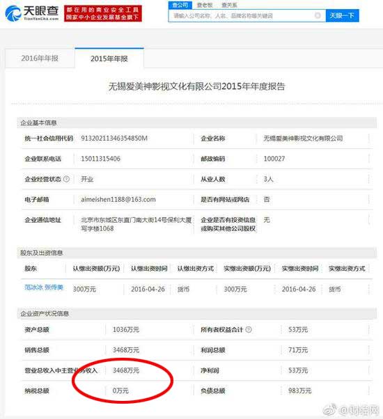 据天眼查无锡爱美神2015年报显示,范冰冰任大股东的无锡爱美神影视文化有限公司,2015年主营业务收入3468万元,利润总额71万元,净利润53万元,利润总额与净利润的差额为18万元,而纳税总额一栏为0。从这张年报表格来看,数据有出入,具体数额应看公司正式报表、银行流水、帐套。