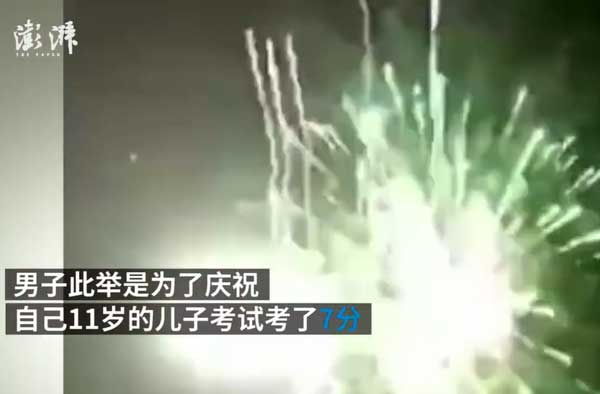 近日,江苏宿迁,周先生为庆祝儿子考了7分,放了一车烟花。周先生说,儿子经常考零分,这次考7分不容易,买了1千元烟花庆祝激励孩子。经过激励儿子已经能考到57分了。