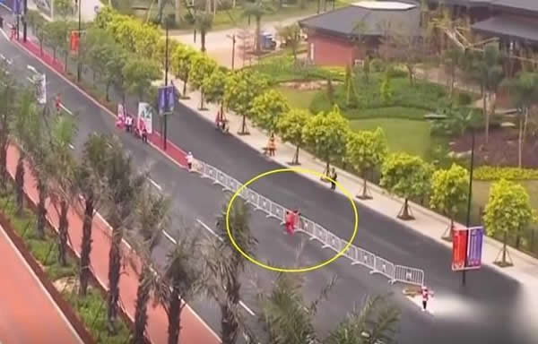 但通过镜头的前后对比,国旗似乎被一名工作人员提前放在赛道边,程乾育跑过去后自己拿起国旗,之后展开向终点冲刺。