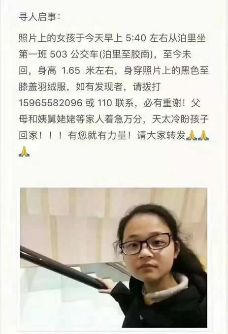 青岛一女高中生凌晨5点离家出走 已失联超72个小时!