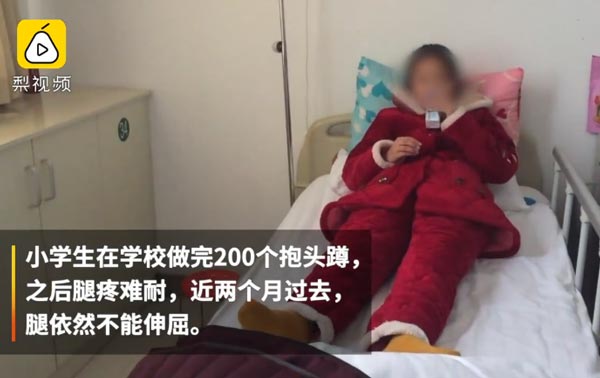 河南禹州,因有人没完成作业,10岁女生和同学做200个抱头蹲。之后她发现腿疼越来越严重,至今不能伸屈,医生诊断为下肢肌肉劳损,髋关节里有少量积水。校长称愿提供帮助,但质疑孩子的病和老师有多大关系。