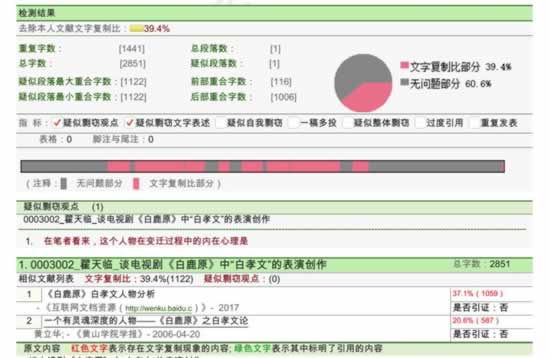 翟天临发表的文章《谈电视剧《白鹿原》中“白孝文”的表演创作》在知网检测后,其结果显示疑似复制他人内容占比39.4%。来源:知网检测报告截图