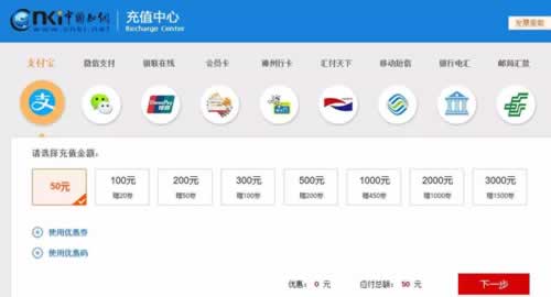 中新经纬了解到,中国知网的充值方式有支付宝、微信支付、银联等9种方式,充值金额不能自定义,最低50元,最高3000元;而只有“移动短信”功能支持最低0.5元的充值金额,但仅限于移动手机号段,且在一些省份不能使用。