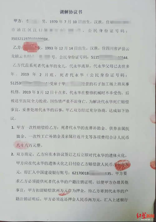 双方于3月16日签署的一份调解协议书显示,厂方一次性赔偿死者代永华的丧葬补助金、供养亲属抚恤金、一次性工亡补助金及亲属往来开支等各项费用合计人民币八十八万元整。因死者离异,父母去世多年,该笔钱在死者火化后支付给了死者女儿丽丽。