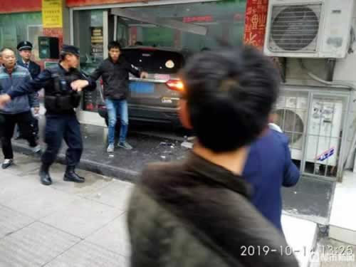 据目击者陈先生介绍,越野车先是撞翻了前面拉矿泉水的三轮车,然后急打方向,一头撞进了路边的邮局门面。冲进银行后,越野车又撞上正在办理业务的市民,将市民抵上了银行柜台之后才停下。