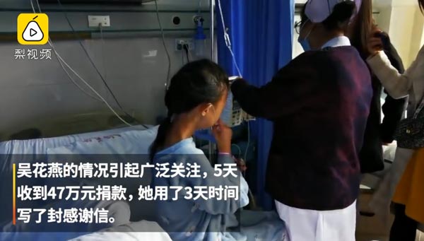 2019年10月30日,贵州贵阳。24岁、43斤女学生吴花燕的事情引发广泛关注。5天时间,她已获捐47万,1天接了上百个电话。医生建议她不要长时间用电话,应多休息。她用3天写下感谢信,称像“丢黑夜里重见太阳一样”。