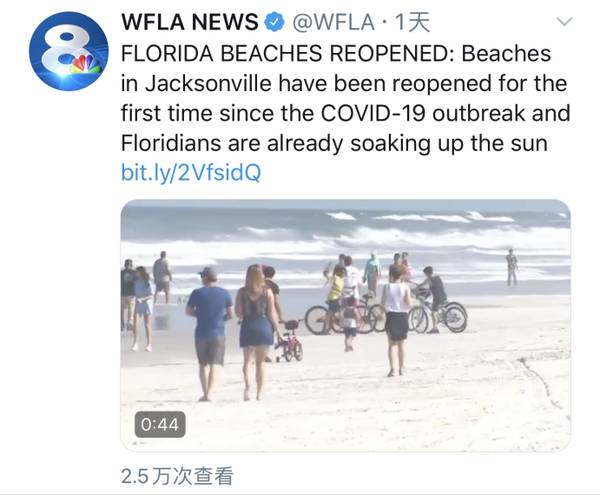 莱克沃思市议员发推批评称:“当一个人不相信科学,他就会做蠢事;而如果一个当权者不相信科学,他就会做危害公众的蠢事。(重新开放沙滩)这一举措蠢透了,我甚至需要确认它不是假新闻。各位,这不是假新闻。”