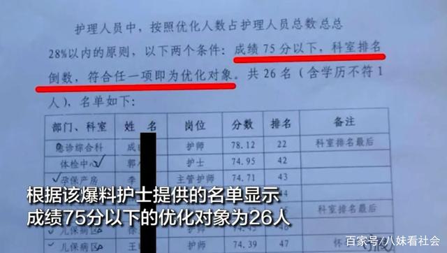该院护士刘女士在4月9日接到其科室主任突然通知才得知自己“被裁了”!根据刘女士提供的名单显示,成绩75分以下的优化对象为26人。记者注意到该名单中有一名护士出于产假,另外两名护士处于哺乳期。一场考试就“末尾淘汰”的“人才优化”做法,医护人员认为既违反法律又不符事实!告知书上显示被优化人员需要在4月15日之前前往人事科办理相关离院手续,工资结算至4月14日,15日前离院者,院方补偿3个月工资,养老保险缴纳至6月份,15日后离院者,额外支付一个月工资,养老保险缴纳至4月份。被优化的医护人员需签署《告知书》、《辞职申请书》和《承诺书》。《承诺书》显示系“自愿离职”并保证不以任何理由向该院主张权利。