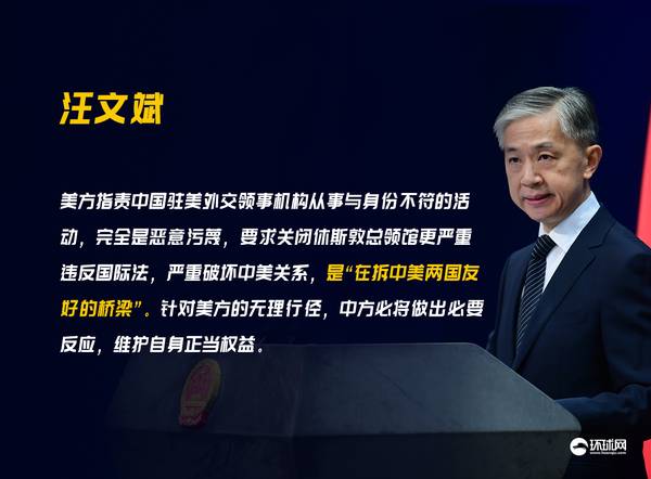 【环球时报-环球网报道 记者白云怡】据美国媒体报道,美国务院22日称,要求中方关闭驻休斯敦总领馆是为了“保护美国的知识产权和信息安全”,坚持两国关系的公正性和对等性。蓬佩奥更指中国驻美使领馆多年来干涉美国内政。对此,中国外交部发言人汪文斌23日回应称,美国声称中国驻美外交机构从事与身份不符的活动完全是恶意污蔑,要求关停休斯敦总领馆更是在“拆中美友好的桥梁”。