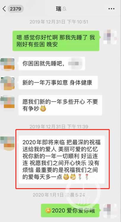 “其实今年过年的时候就有迹象,他说回广东父母家过年,实际上是回了他妻子家。他父母一直在河南老家。”小丽说,2019年12月31日刘某瑞曾发祝福短信称送给最爱的人。而在同日,小文也收到了同一条信息。