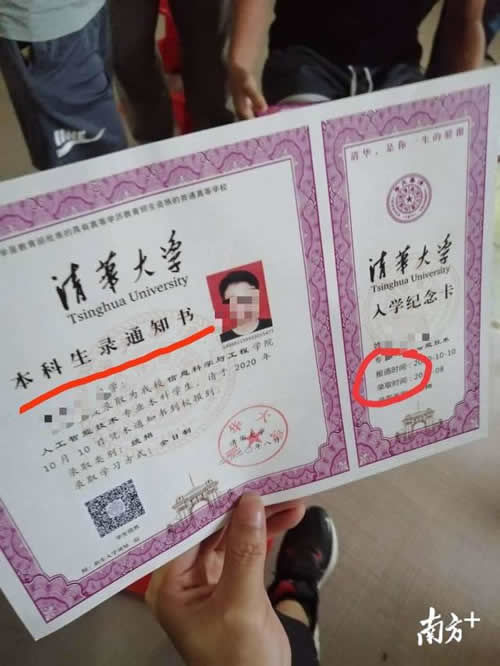 8月19日,有网友向南方+记者报料,湛江雷州市调风镇一学生自称考上清华大学,伪造录取通知书。