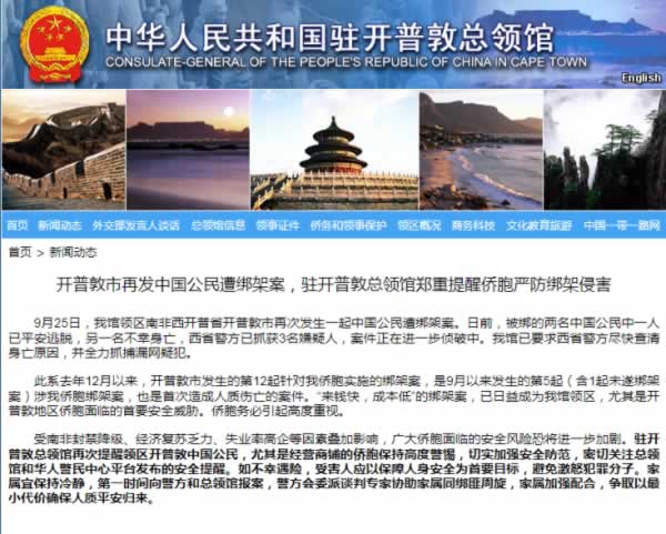 (原题为《开普敦市再发中国公民遭绑架案,驻开普敦总领馆郑重提醒侨胞严防绑架侵害》)