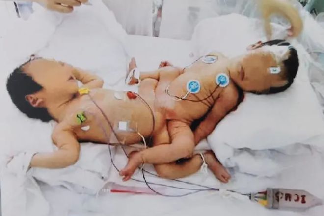 宝宝和贝贝一出生就相连,连接部位从脐部至会阴,医学术语称为“坐骨连体”。她们分别拥有独立的心脏、肝脏、肾和膀胱,但消化系统、生殖系统、泌尿道等多处畸形。其中,贝贝先天性无肛,没有独立直肠、结肠,与宝宝共用一条结肠,远端小肠也彼此相连。